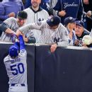 Betts leaped at the retaining wall in foul territory and caught Gleyber Torres‘ pop fly in the first inning, but a fan in the first row with a gray Yankees road jersey grabbed Betts’ glove with both hands and pulled the ball out. Another fan grabbed Betts’ bare hand.