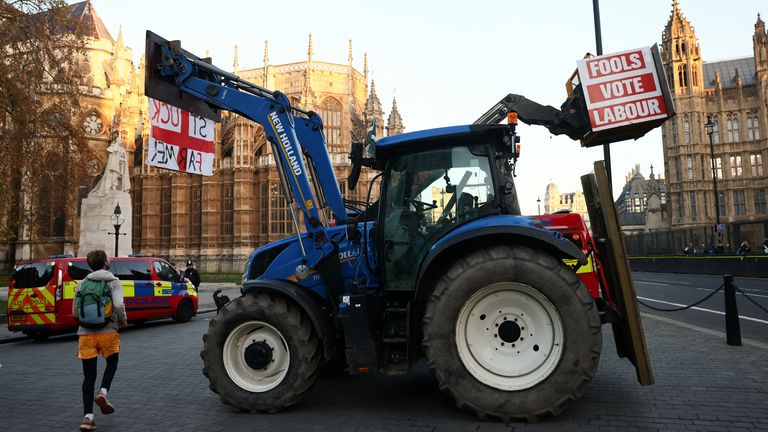 A person passes a tractor which is displaying an anti-Labour Party sign, parked outside the Houses of Parliament. Pic: Reuters